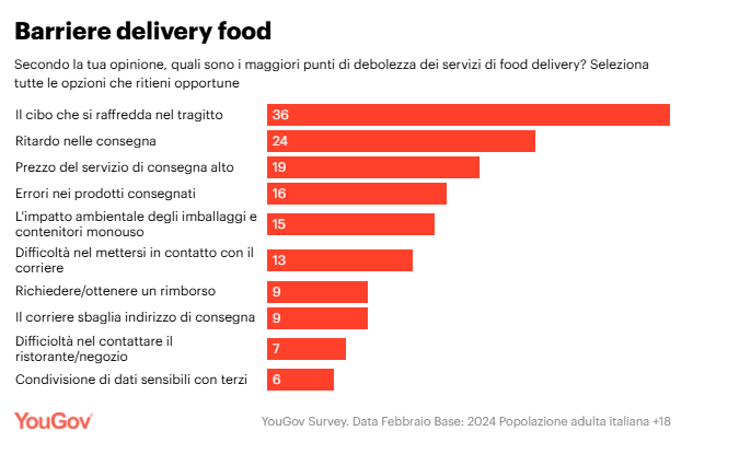 Dal report emergono anche le problematiche legate ai servizi di app delivery esterne, come il fatto di ricevere il cibo freddo, i ritardi, i costi eccessivi, gli errori nelle consegne e le difficoltà nella comunicazione con il ristorante per segnalare eventuali incongruenze.